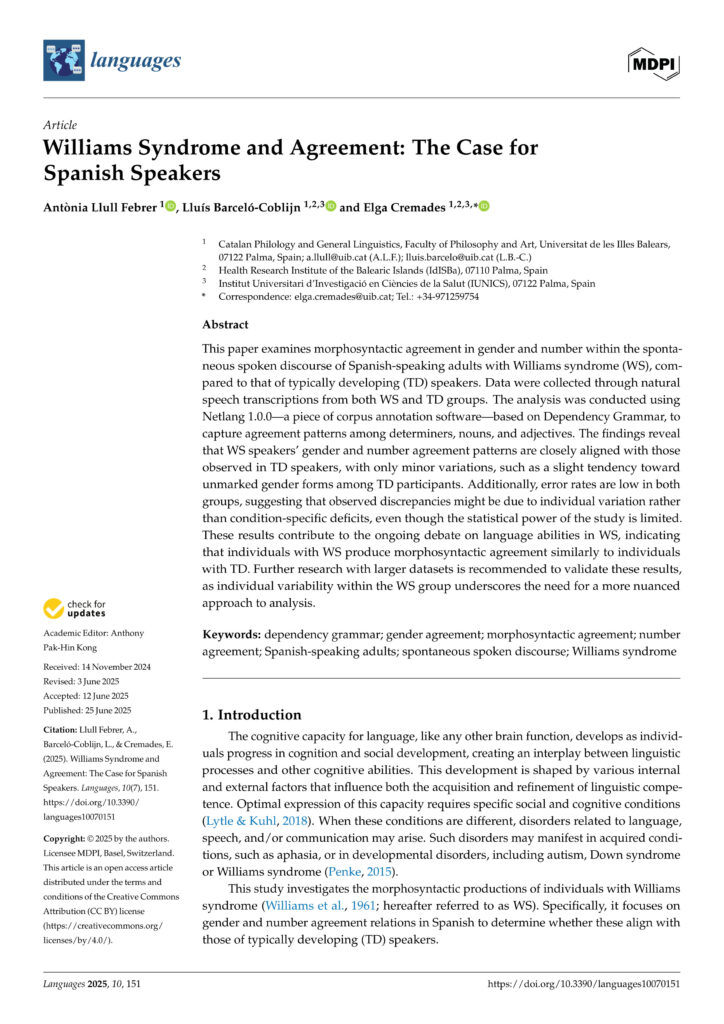 Llull Febrer, A., Barceló-Coblijn, L., i Cremades, E. (2025). Williams Syndrome and Agreement: The Case for Spanish Speakers. Languages, 10(7), 151. https://doi.org/10.3390/languages10070151