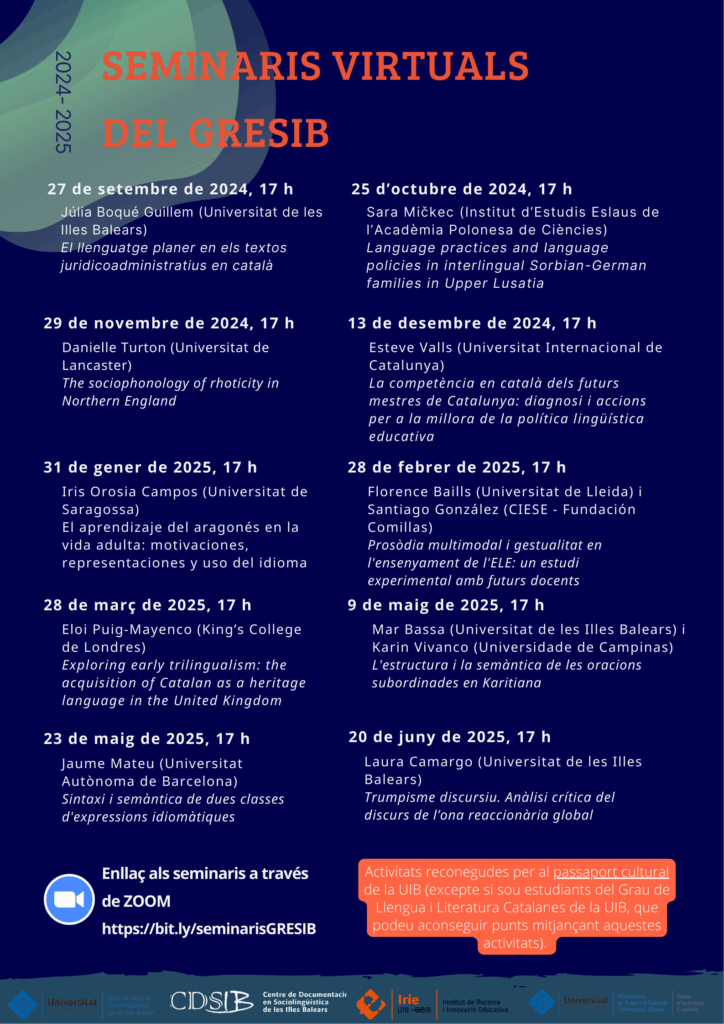 Des del curs acadèmic 2020-21, el GRESIB organitza un cicle de seminaris que tracten temàtiques diverses relacionades amb la sociolingüística i disciplines relacionades. Les sessions tenen una periodicitat mensual i es realitzen en línia a través d’aquest enllaç. Per assistir a les sessions, no cal inscripció prèvia. A més, els Seminaris virtuals del GRESIB són una activitat reconeguda per al passaport cultural de la UIB.