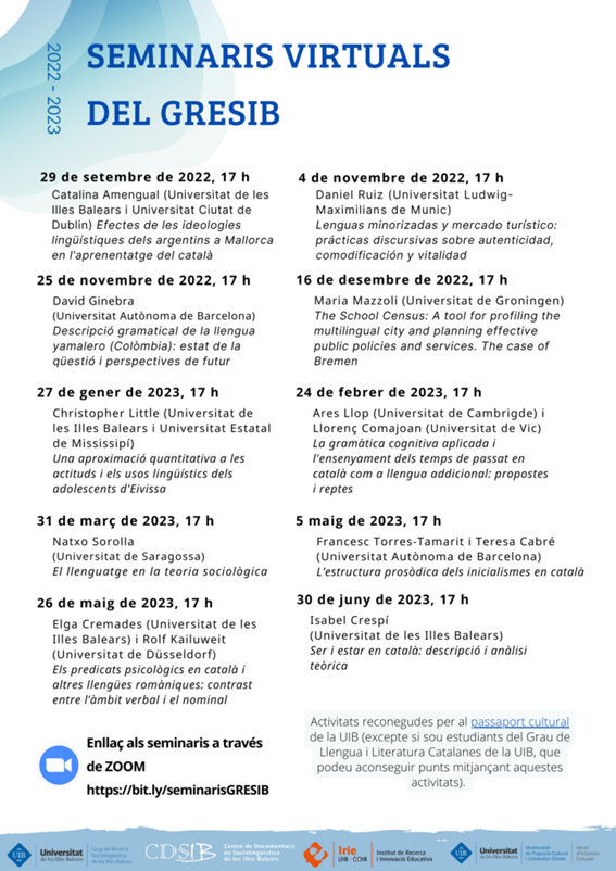 Des del curs acadèmic 2020-21, el GRESIB organitza un cicle de seminaris que tracten temàtiques diverses relacionades amb la sociolingüística i disciplines relacionades. Les sessions tenen una periodicitat mensual i es realitzen en línia a través d’aquest enllaç. Per assistir a les sessions, no cal inscripció prèvia. A més, els Seminaris virtuals del GRESIB són una activitat reconeguda per al passaport cultural de la UIB.